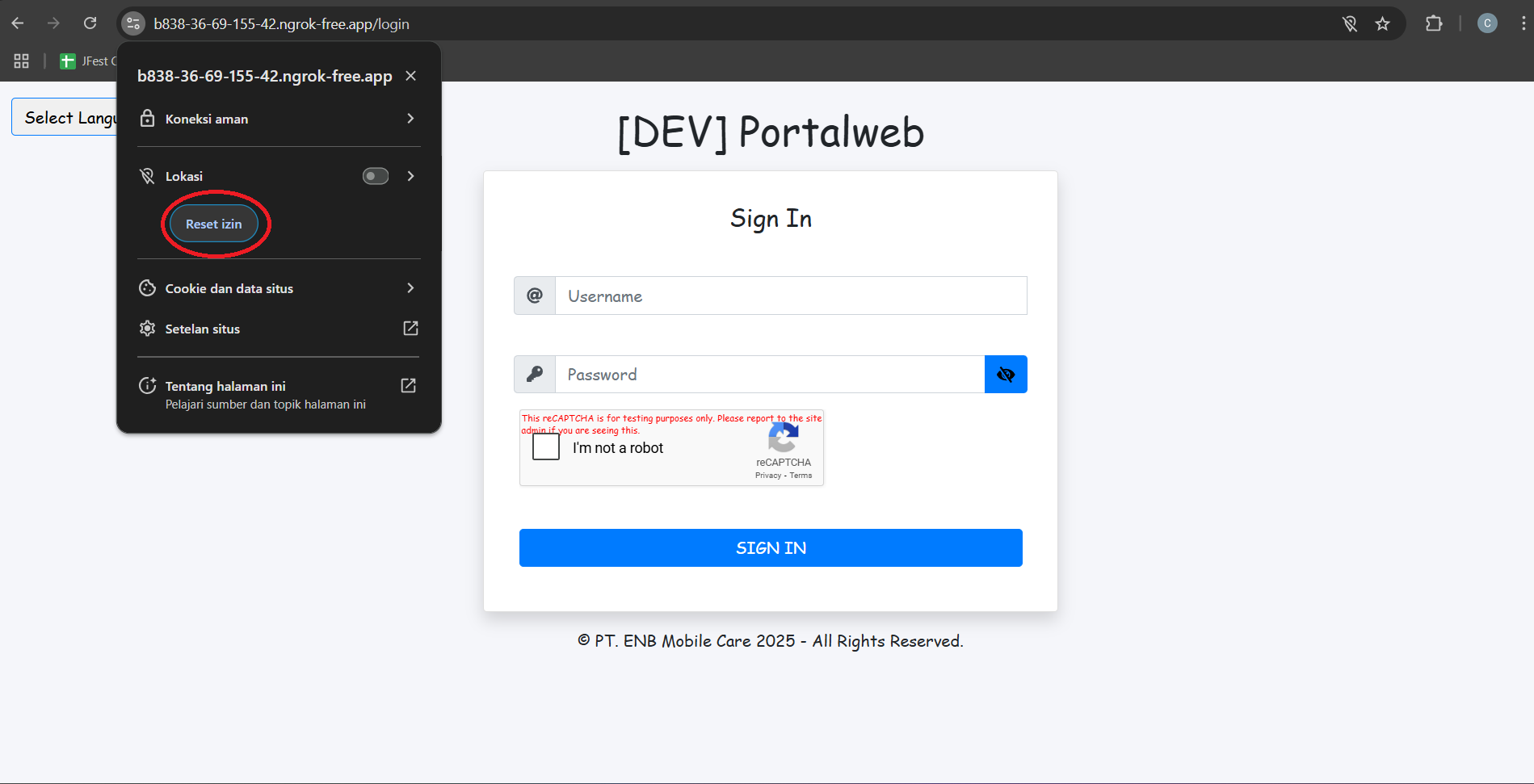 After clicking, a popup will appear like the image above. In the location section there is a reset button, click the button to reset the location permission. After that, refresh or reload your browser and do the location permission.